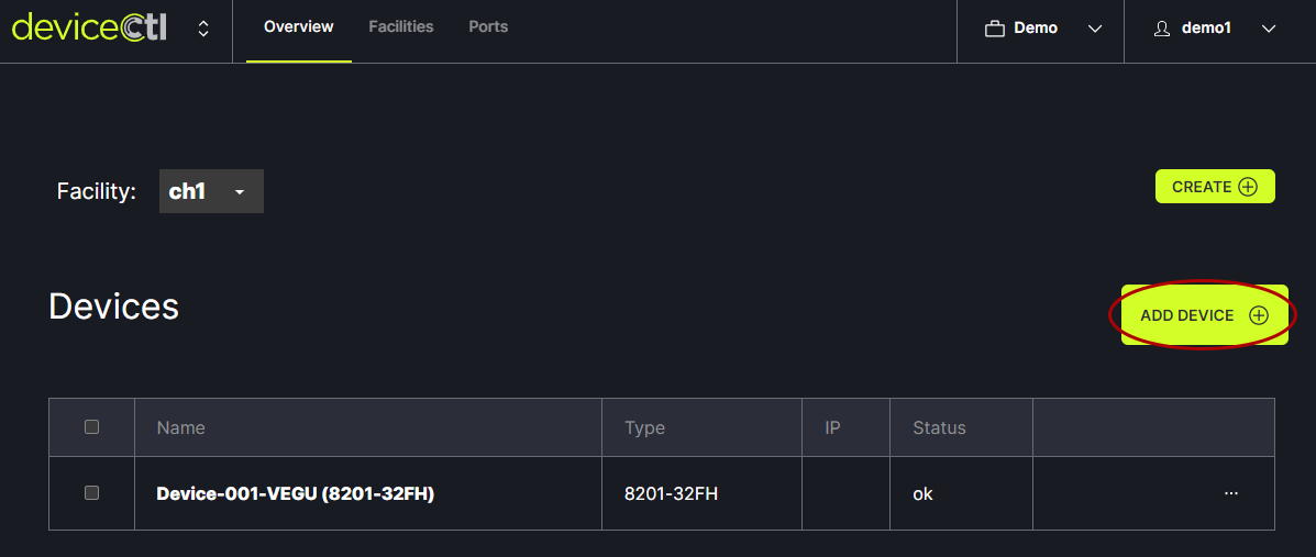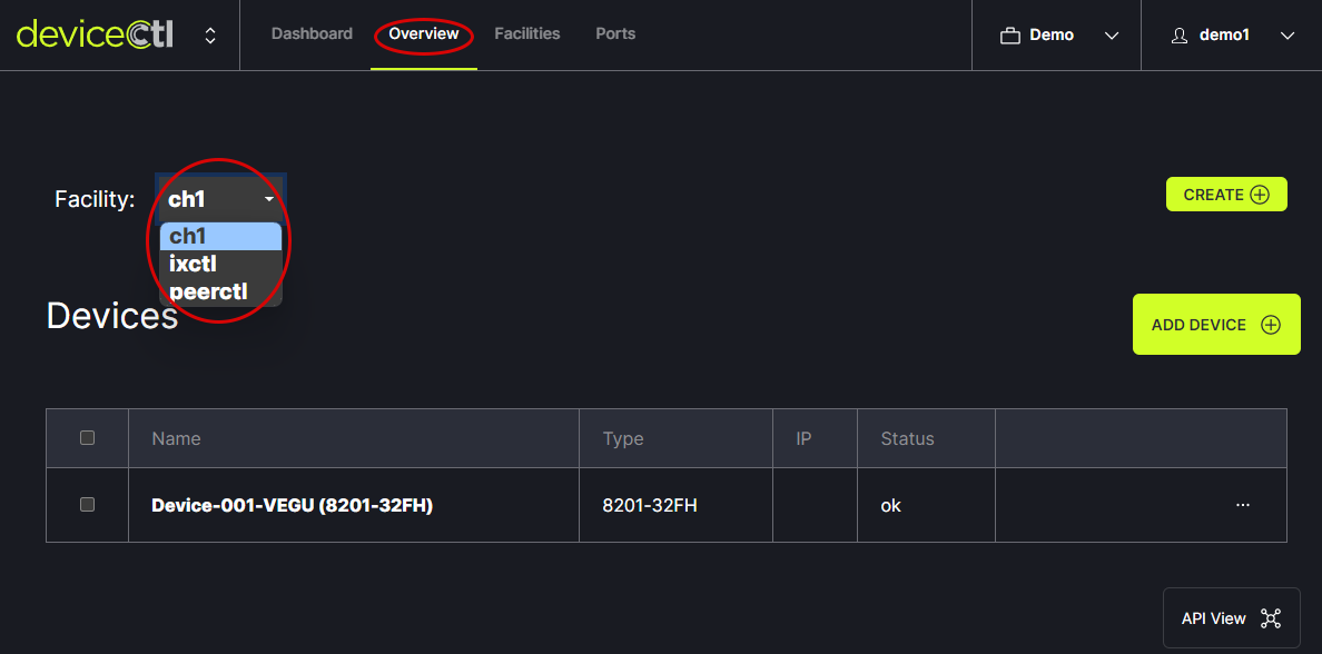From the Overview tab in the header menu, choose the facility to work with from the drop down menu.