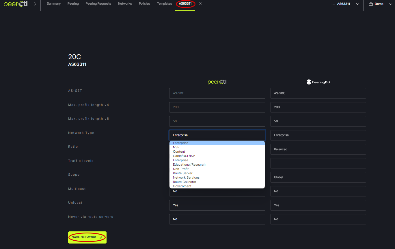 ASN Tab Information about the selected network (or asn) can be edited using the dropdown options to override what comes from PeeringDB. Previous Next