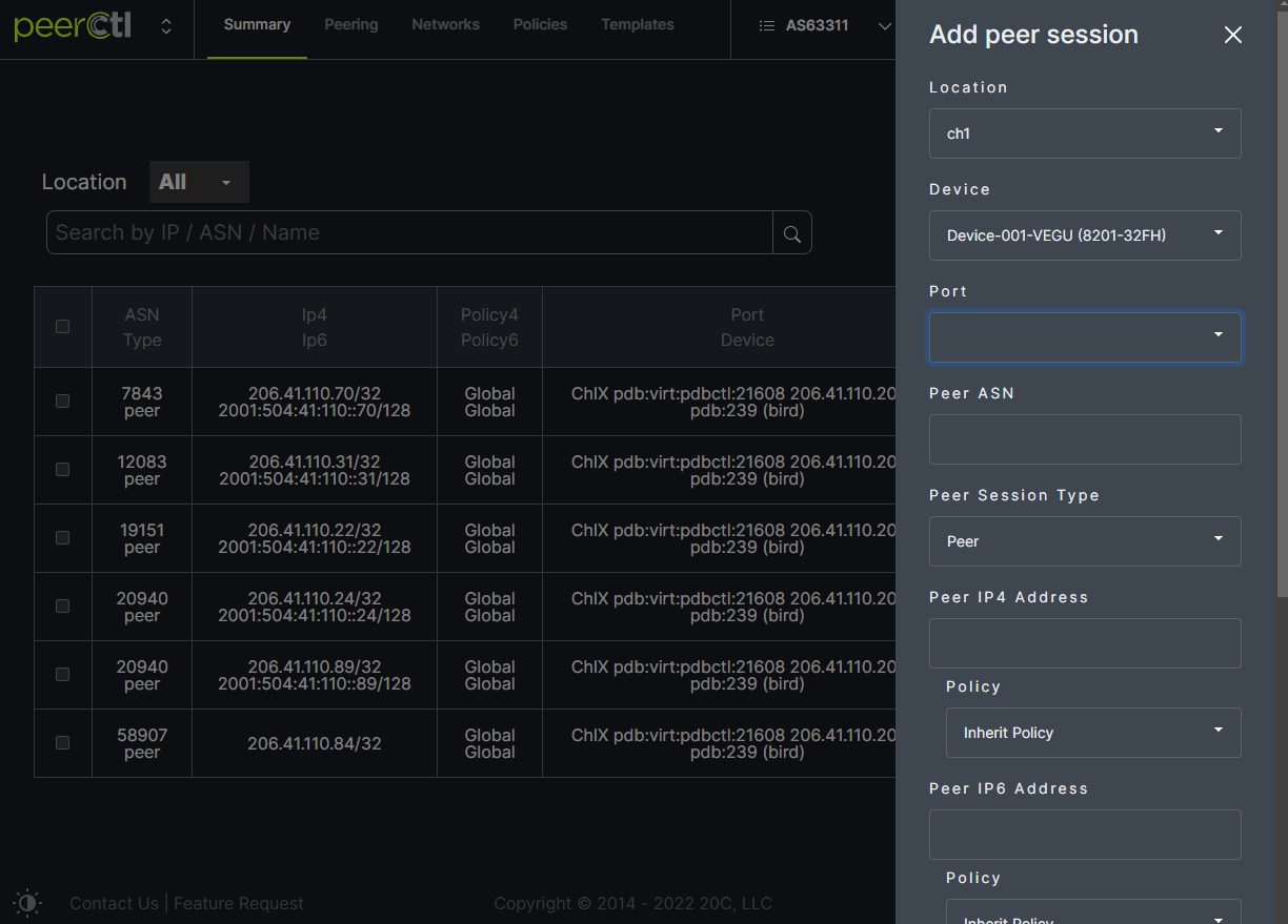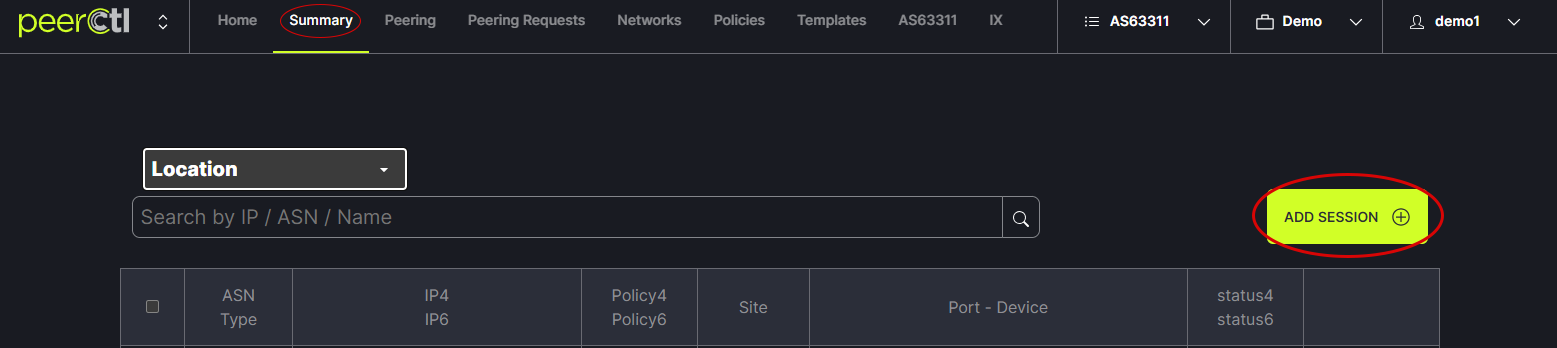 To add a peering session, click on the Summary tab in the header menu. Select the Location to which a peering session will be added from the drop down menu at the top of the window. Click on the Add Session button.