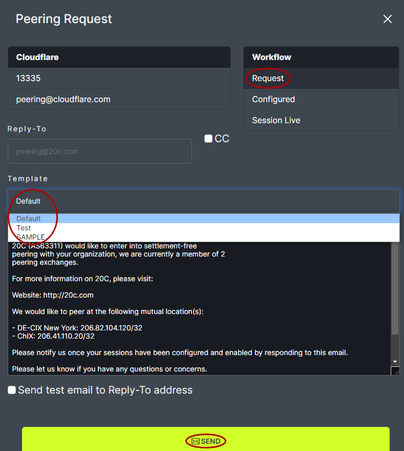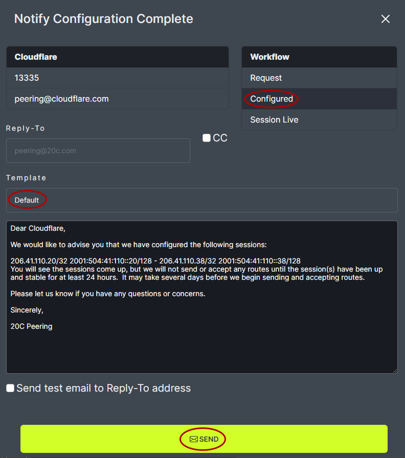 Once the network has confirmed the request, provided configuration information and the connection has been configured, the next step is to confirm this with the network. Click on the Request Peering link for the desired network. The Configured step will be highlighted in the Workflow. Choose the Default or Custom email template and click Send.