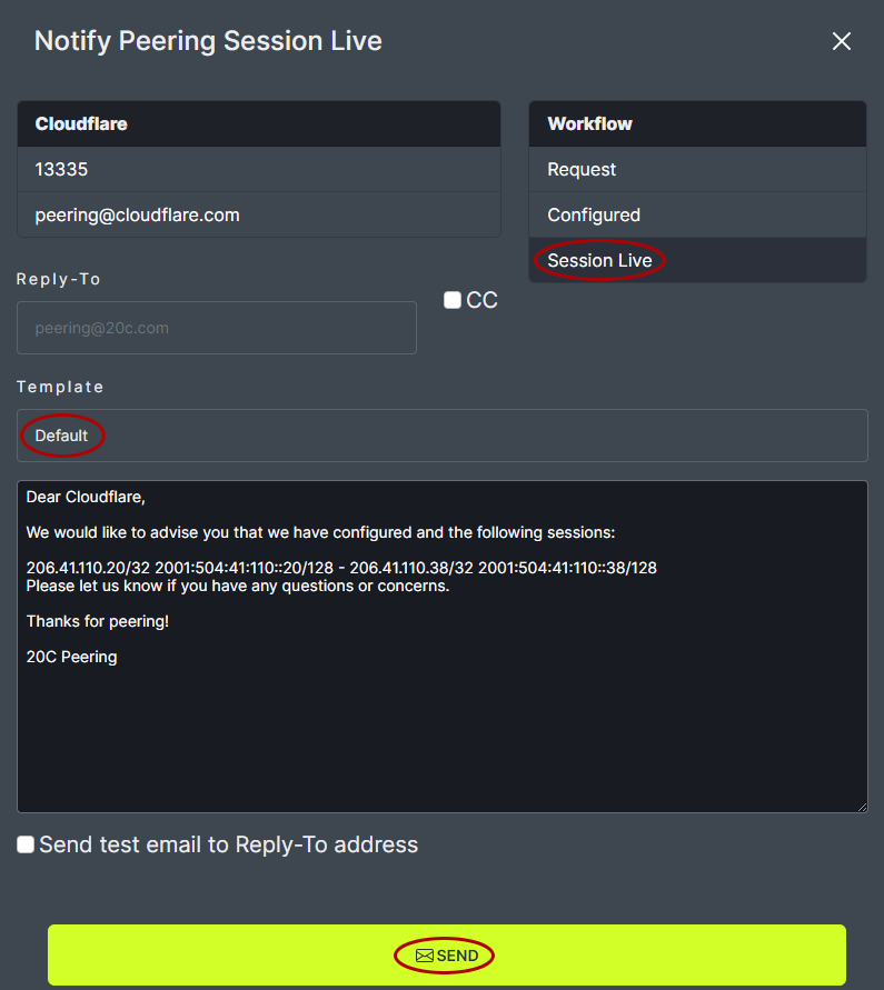 When the request has been completed, click on the Request Peering link for the desired network. The Session Live step will be highlighted in the Workflow. Choose the Default or Custom email template and click Send.