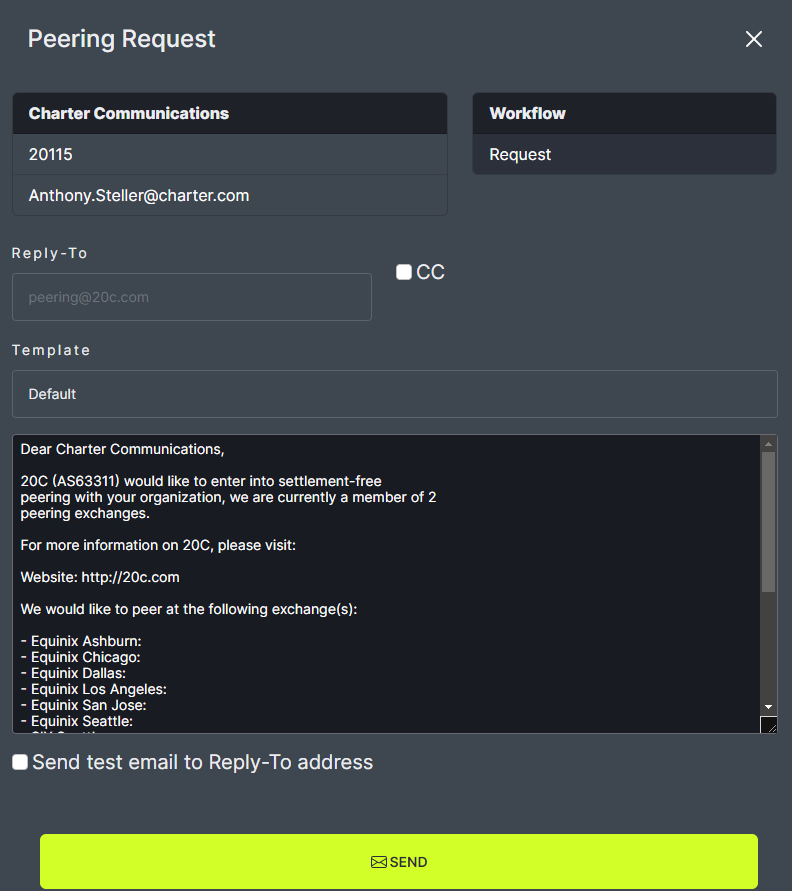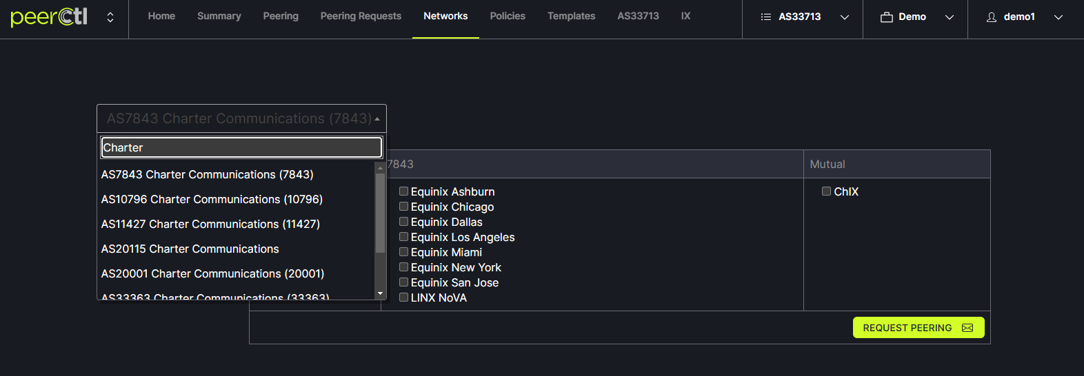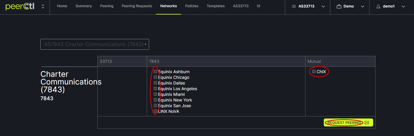 Check the desired boxes for connections and click on the Request Peering button.