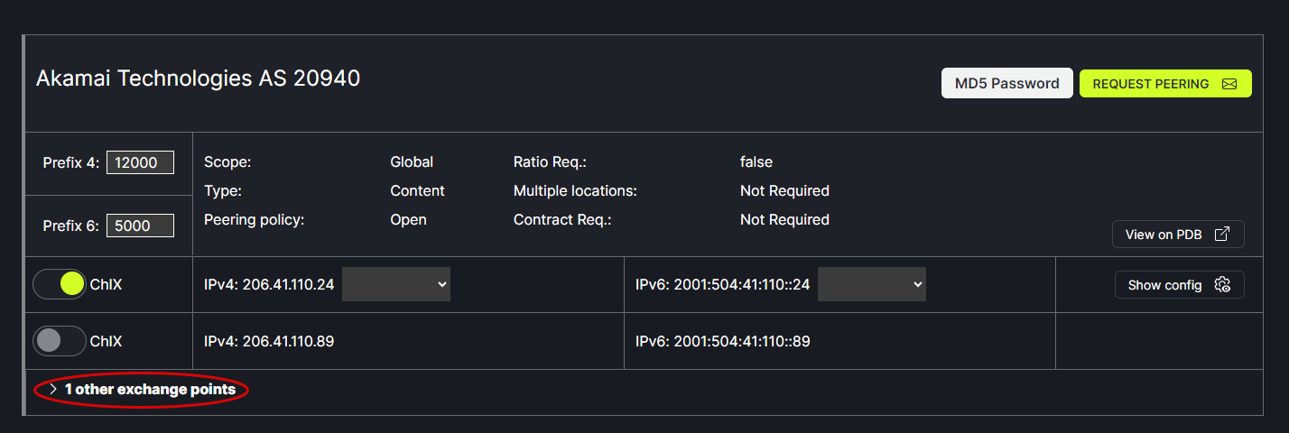 Note: When a peering request is made it includes all the shared exchange points. The shared exchange points can be viewed by clicking the arrow next to Shared Exchange Points.
