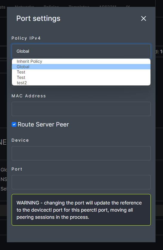 Setting the Policy allows users to set the default router configuration at a given network. There are two default options for setting the Policy: Global or Inherit Policy. Custom policies can also be created. The option chosen will be the default for all connections at this port. To choose a policy, click on the gear icon next to the Exchange/Port.