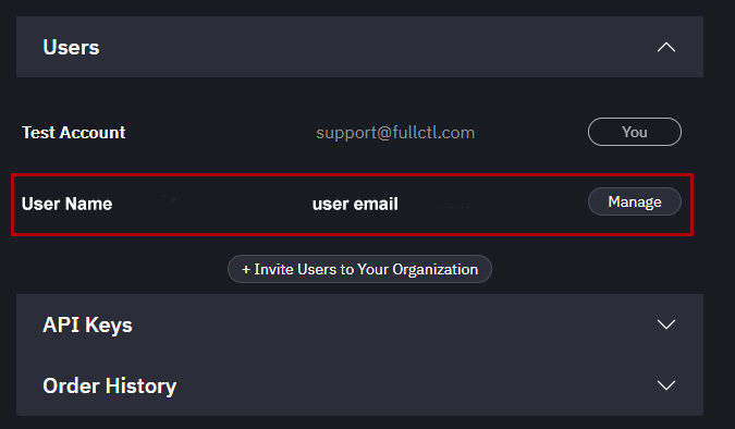 After a new user has accepted the invitation and created an account their name will appear in the list of Users. To assign User privileges, click on the Mange button next to the Users name.