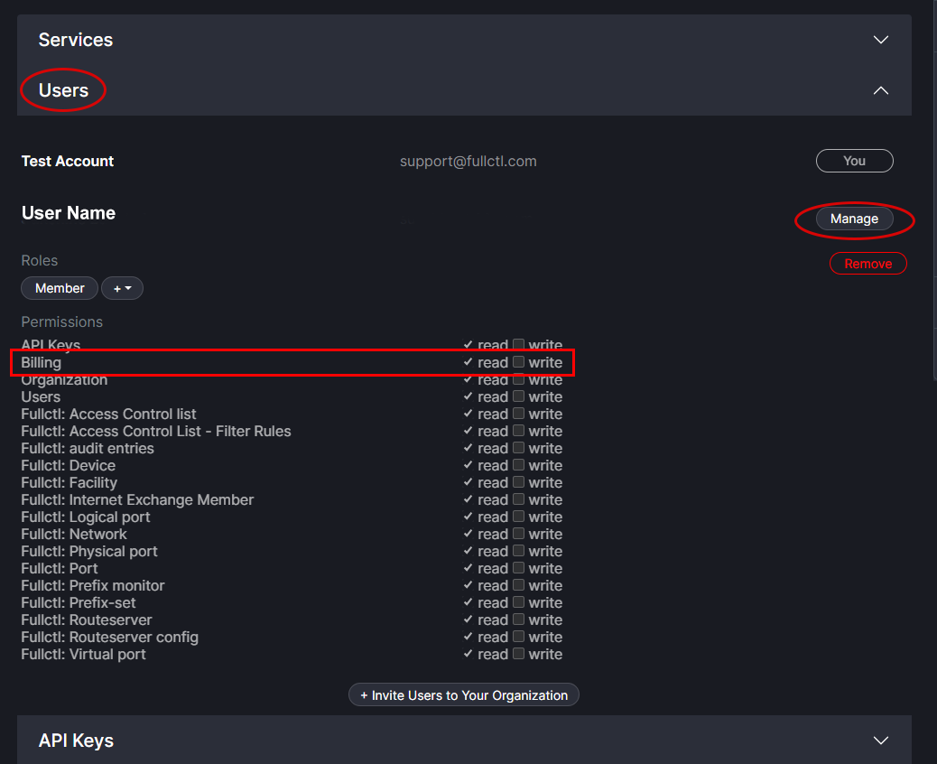 Billing information can only be added by Organization Admins or by Users who have been granted read/write access to the billing option by Organization Admins. To grant read/write permissions for a User, go to the Users section of aaaCtl. Click on the Manage button next to the User's name. Under Permissions, check the write box for Billing.