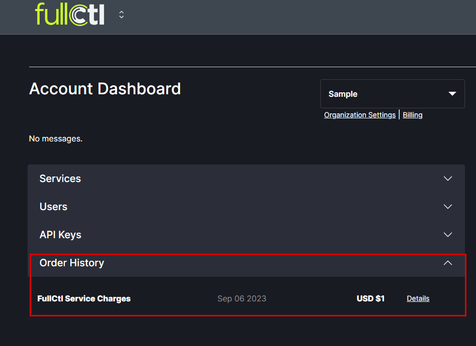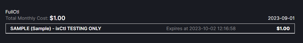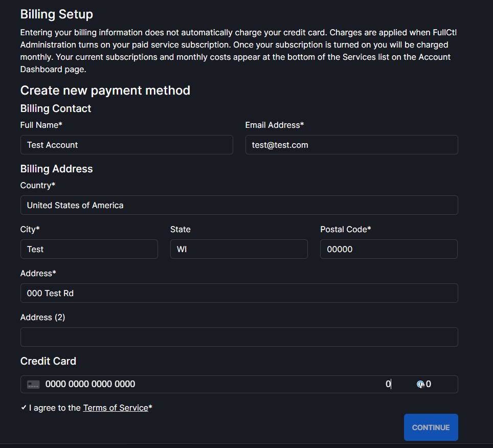 Entering your billing information does not automatically charge your credit card. Charges are applied when FullCtl Administration turns on your paid service subscription. Once your subscription is turned on you will be charged monthly. Your current subscriptions and monthly costs appear at the bottom of the services list.