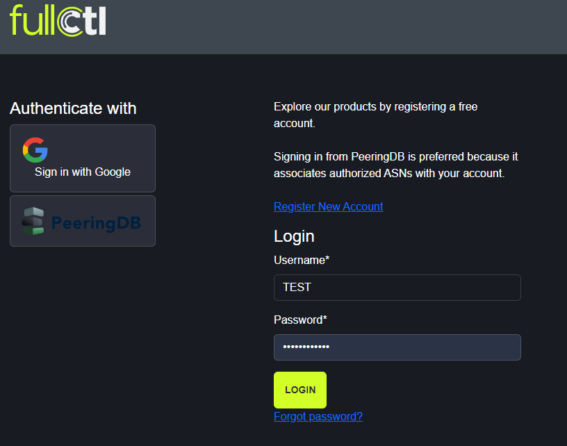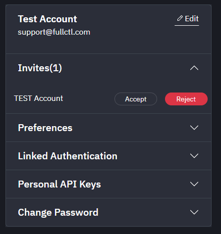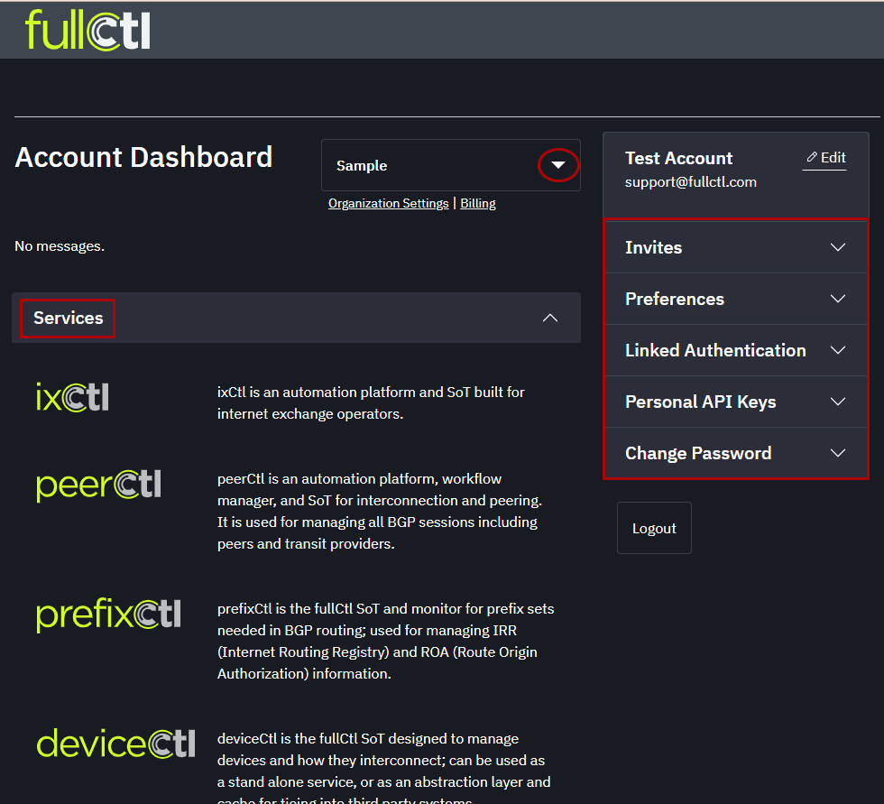 Once logged in, there is access to the Account Dashboard. From the Dashboard, use the menu on the right to edit account information, change preferences, access authentication and personal API key information, and change password. The services section provides access to the different FullCtl products. Use the drop-down arrow next to your name to switch between accounts.