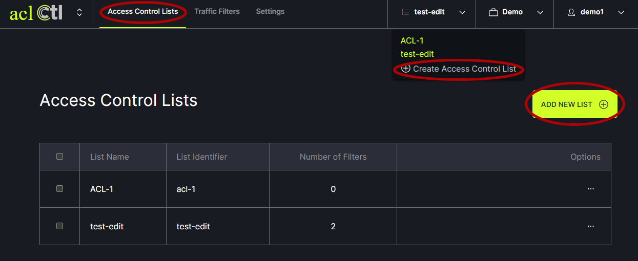 Access Control Lists are used to manage filter rules. The filter rules are contained within Access Control Lists. There can be multiple lists of rules. To add a new list, click on the Access Control Lists tab in the header menu. Then click the Add New List Button on the right side of the screen or the Create Access Control List option in the drop down in the header.