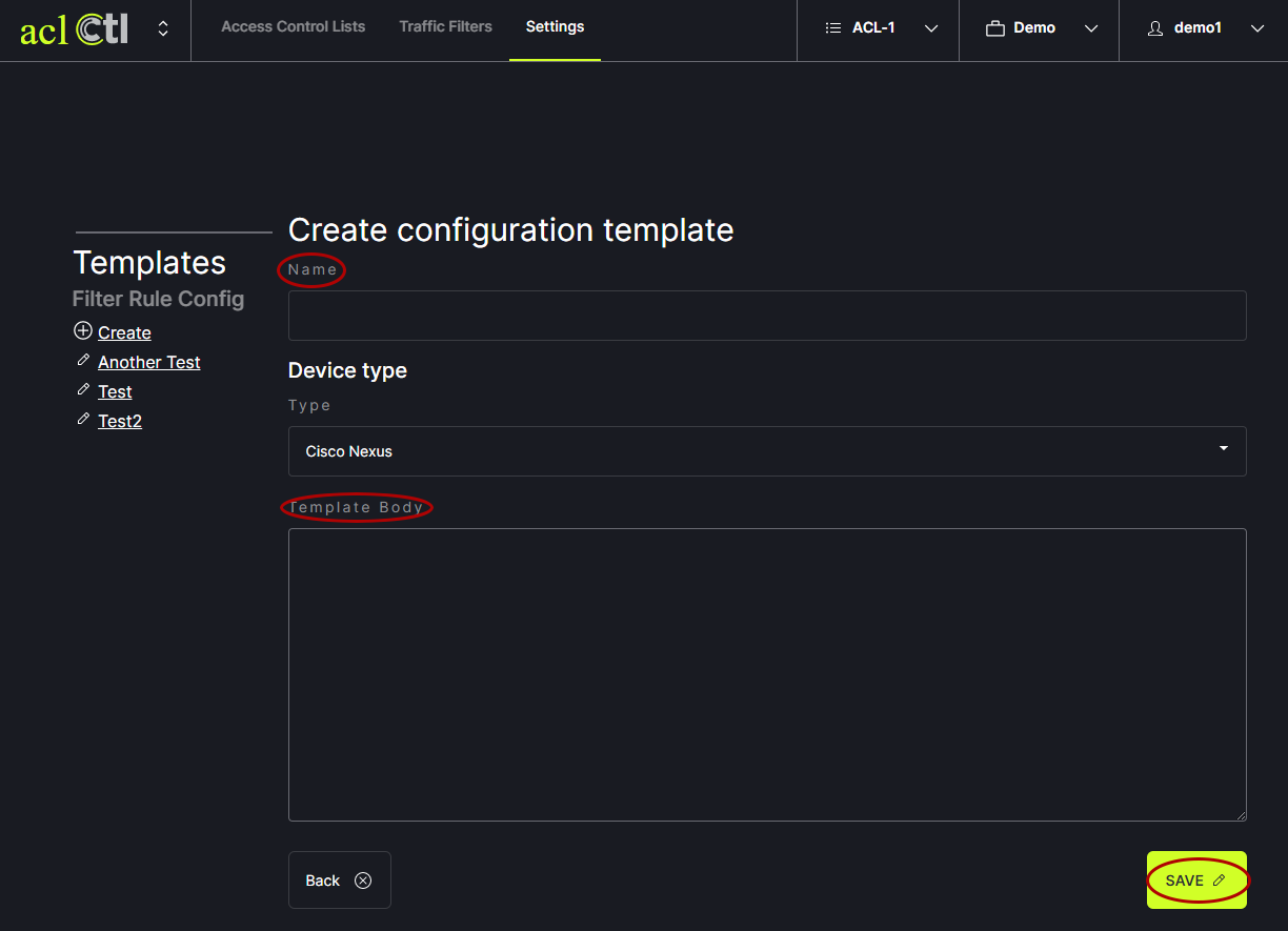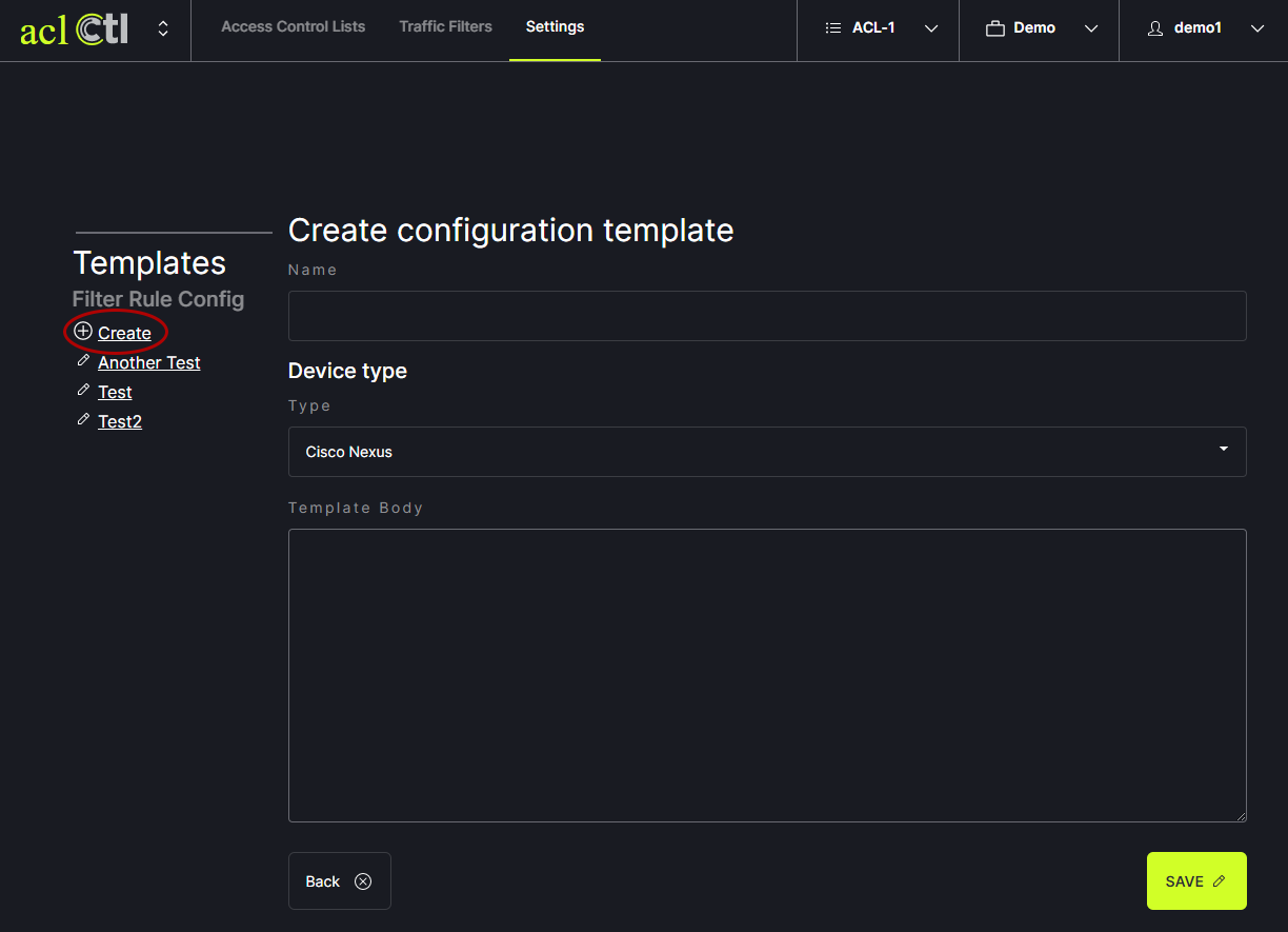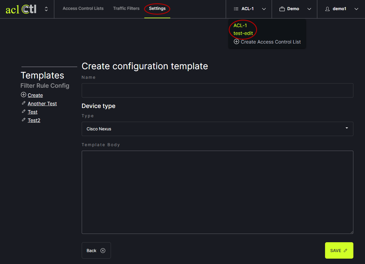 A template is then used to generate an access control list configuration for your device. To add a template, click on the Settings tab in the header menu. Choose the list for which a template is desired from the drop down menu in the header.